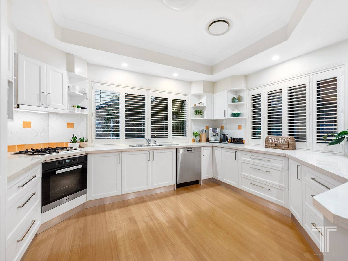 Adjoining the lounge and dining area is an elegant Hamptons style kitchen with room for the active chef and family to cook. Featuring sleek stone benchtops, soft close cabinetry and Miele appliances, prepare meals here to be enjoyed on the private rear patio. Covered for year-round entertaining and featuring a built-in BBQ, roll-down shade screens and a servery window to the kitchen, this alfresco space adjoins the low maintenance yard and leafy gardens.