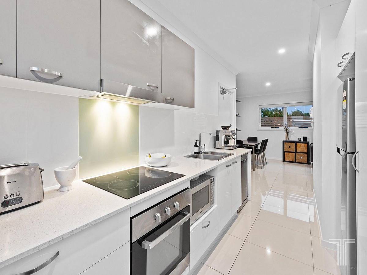 Well-appointed, the galley-style kitchen boasts lovely stone benchtops, sleek white cabinetry, a suite of stainless steel appliances and an induction cooktop.