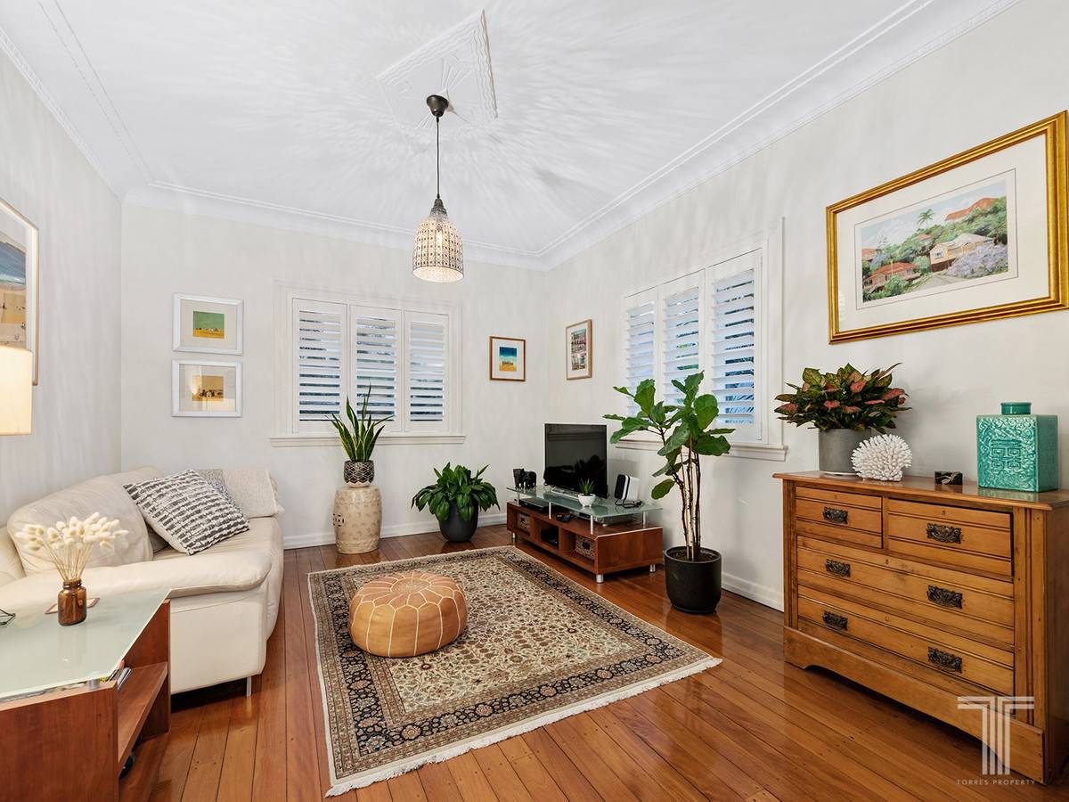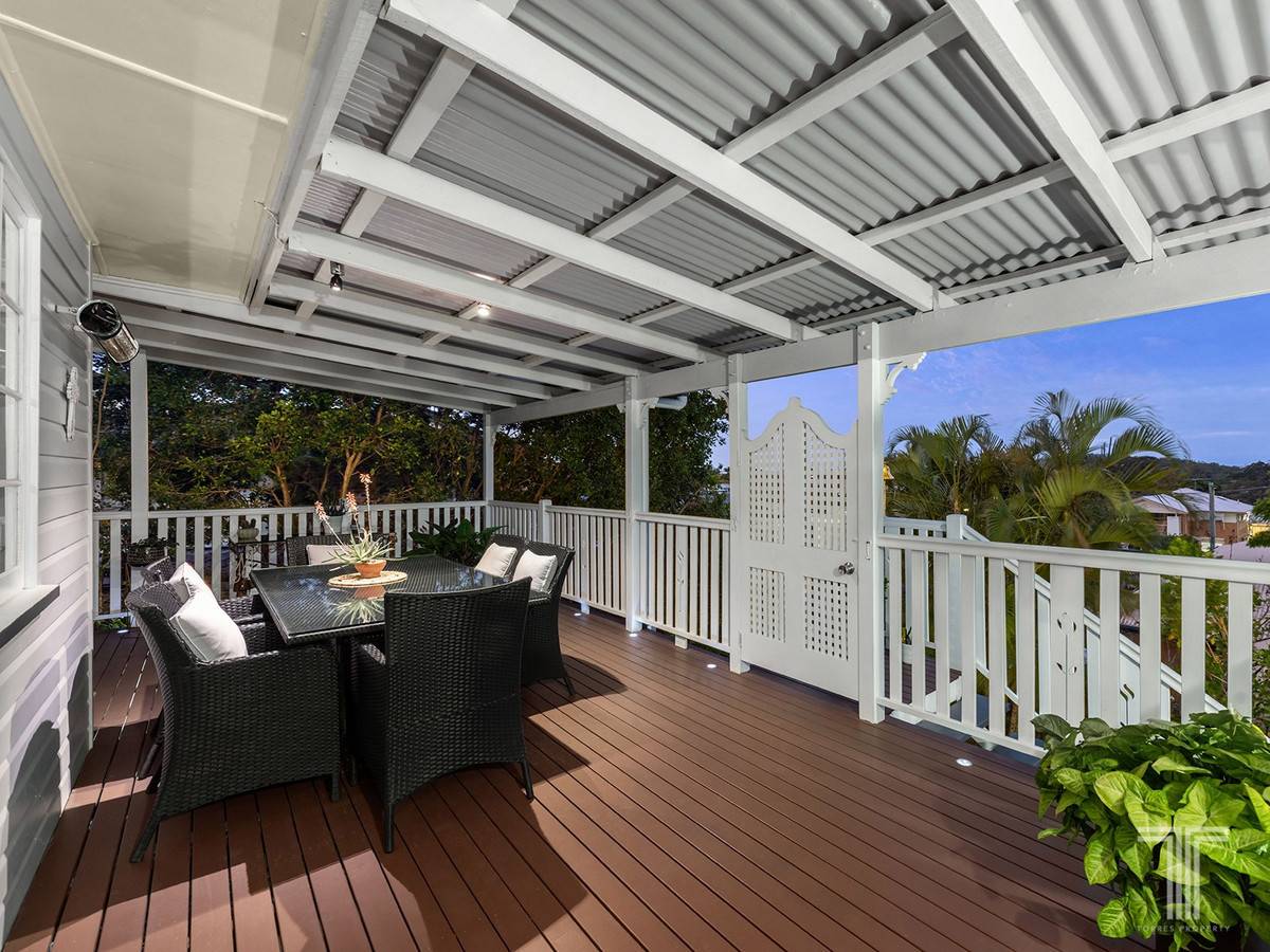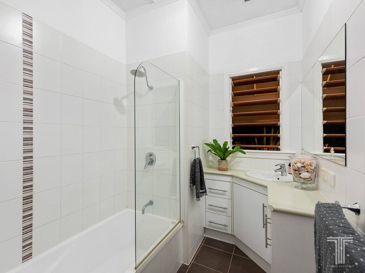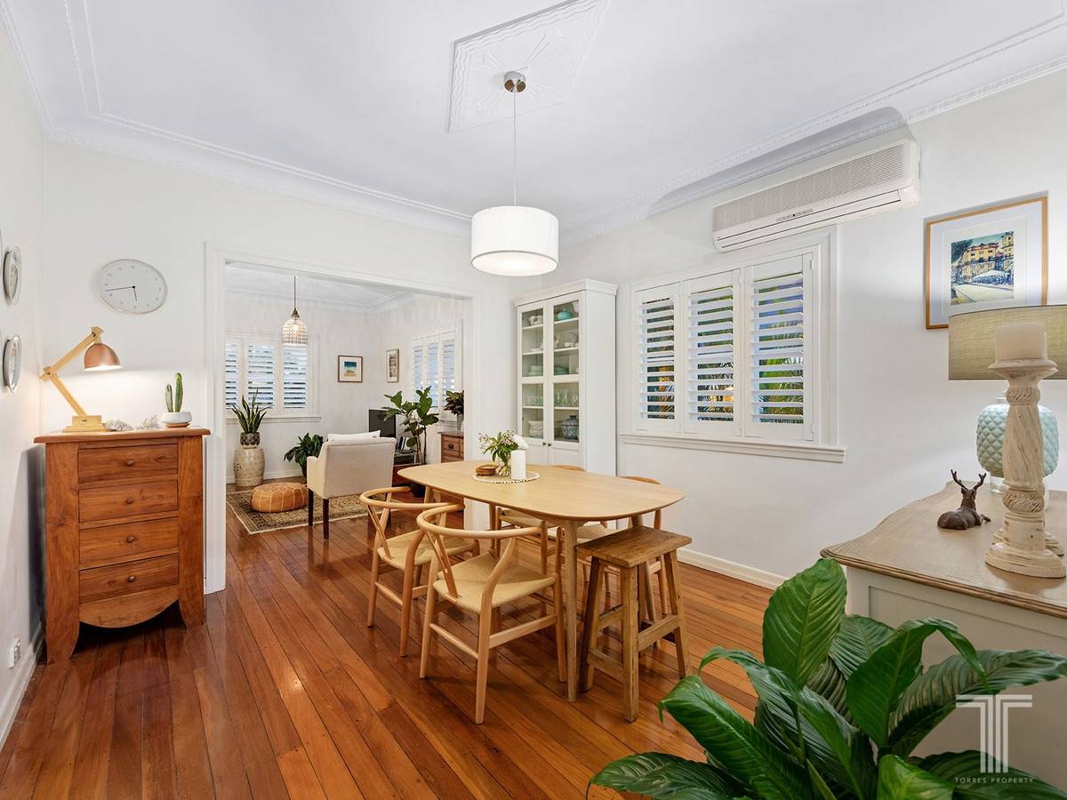 Entering onto the upper floor, the enclosed front deck guides you into the inviting lounge and air-conditioned dining room. Adorned with polished hardwood floors, plantation shutters and decorative cornices, these character-filled living spaces create a warm and inviting ambience from the moment you step inside.