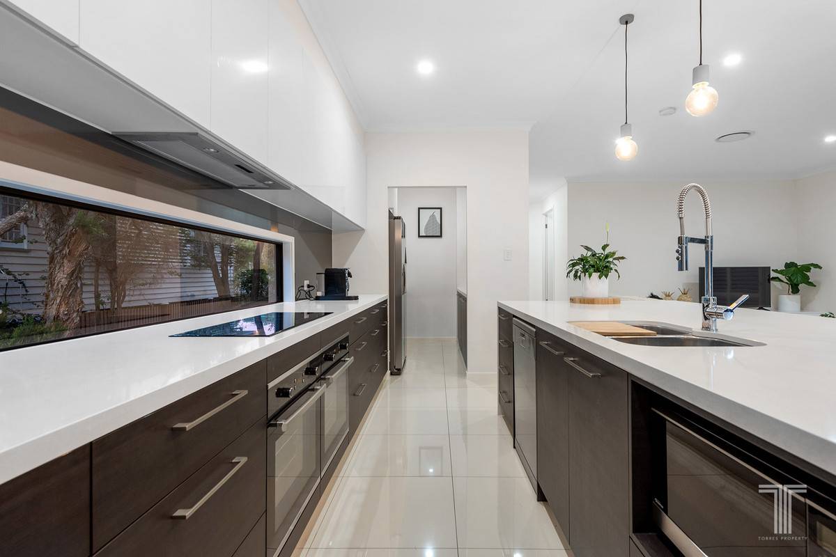 Open, airy and beautifully designed, the ground floor hosts a free-flowing lounge and dining area. Adorned with tiled flooring, downlights and plantation shutters, this sophisticated family space adjoins the gourmet kitchen equipped with a 1.4m wide stone island bench, dual ovens, butler's pantry and gorgeous pendant lighting.