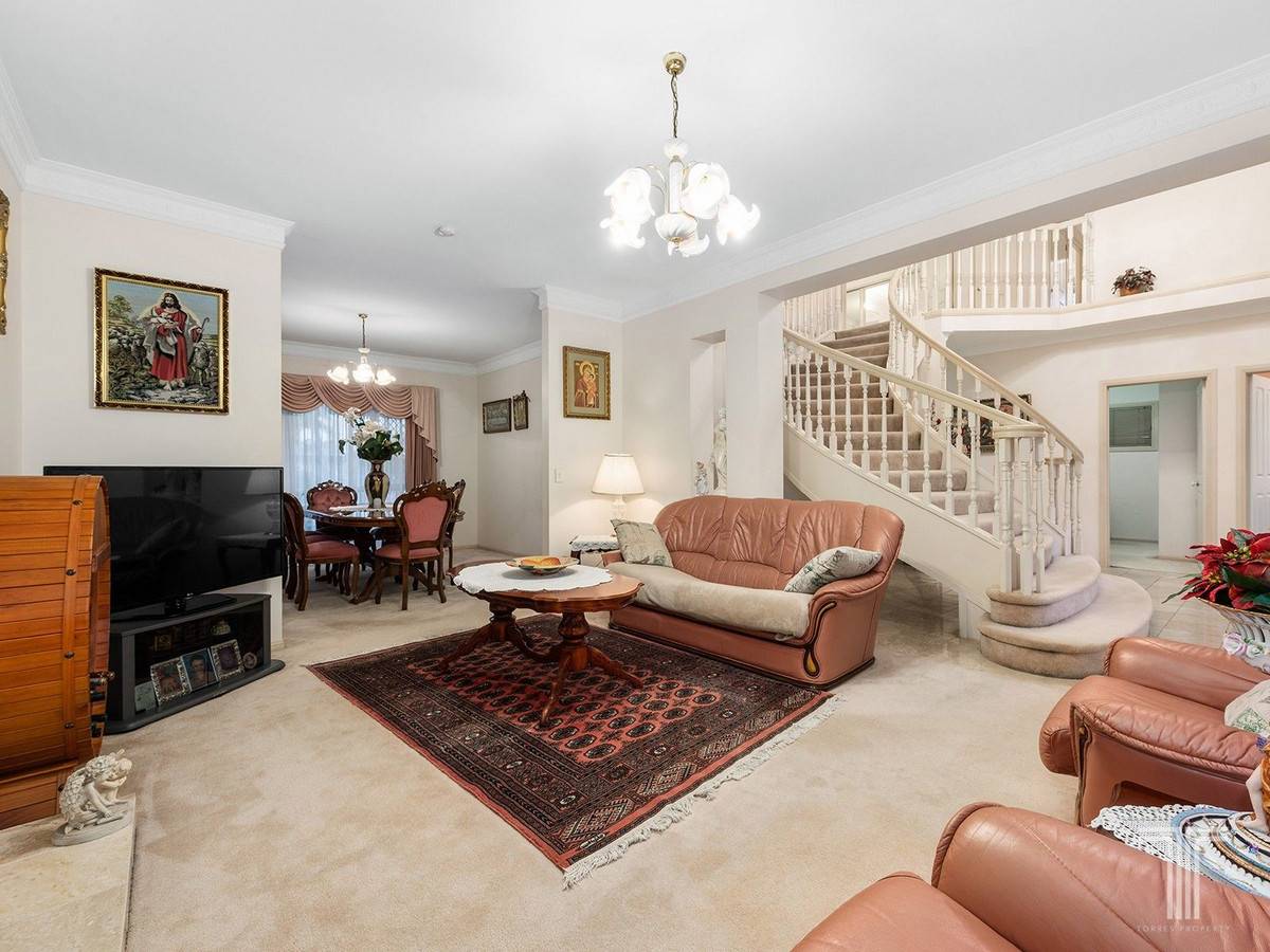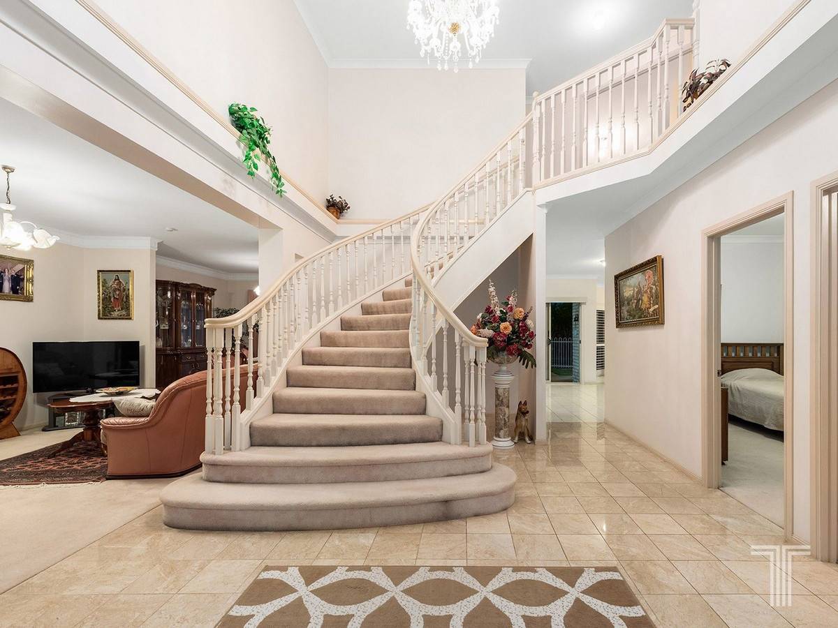 Exuding exceptional street appeal with a wide frontage and landscaped gardens, the home enters into a formal entryway revealing a grand staircase and chandelier.
