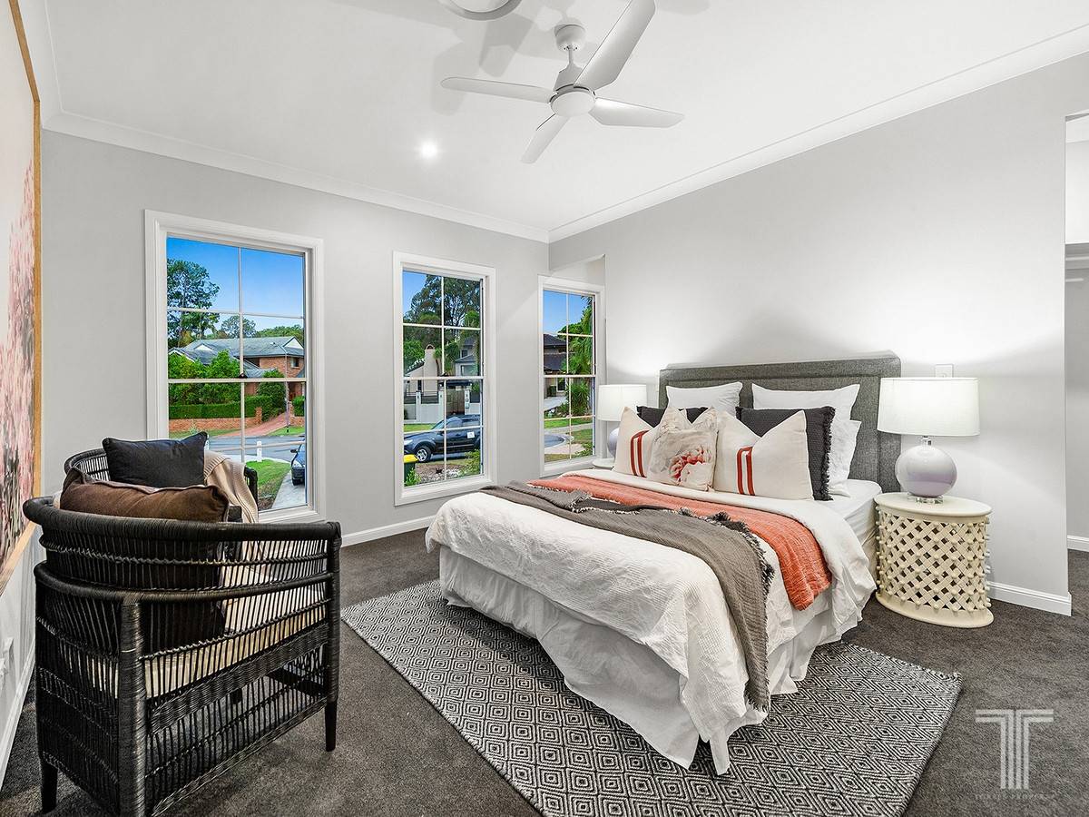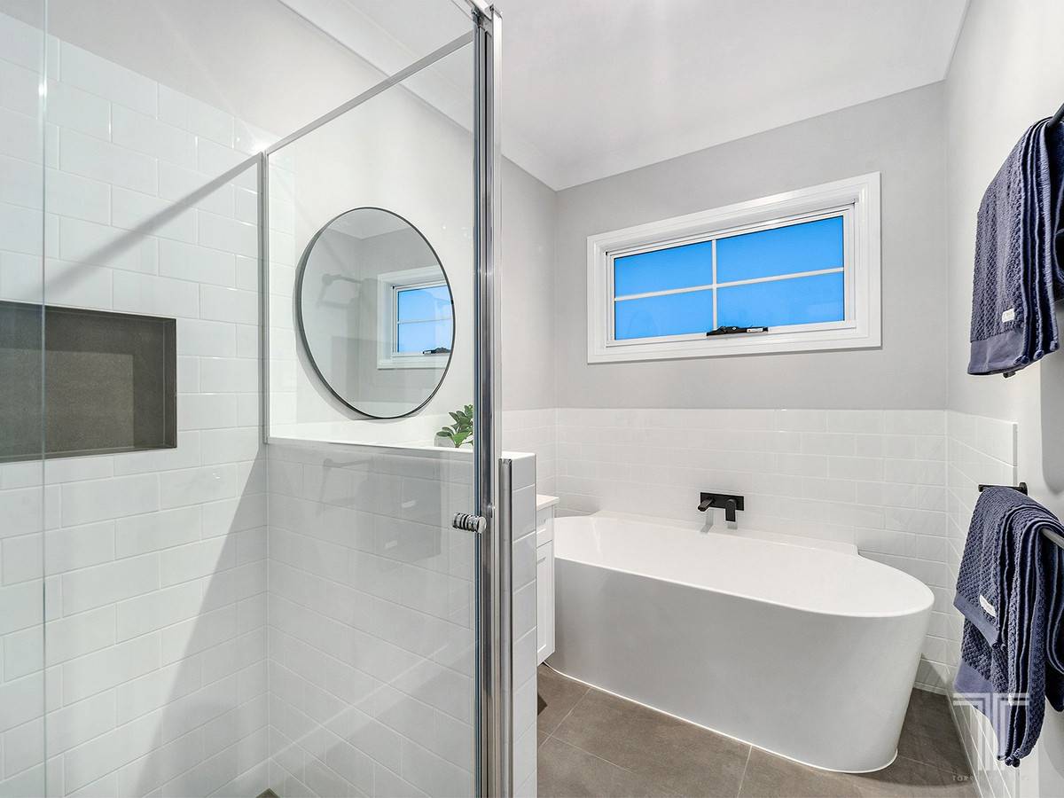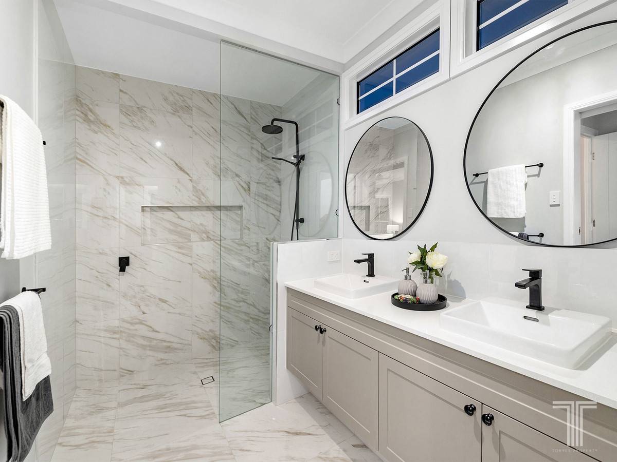 Lavishly appointed, the exquisite master suite reveals a hidden walk-through robe and a flawless ensuite adorned with matte black fixtures and dual vanities. Serviced by a second bathroom with a freestanding bath, the additional bedrooms all include built-in robes.