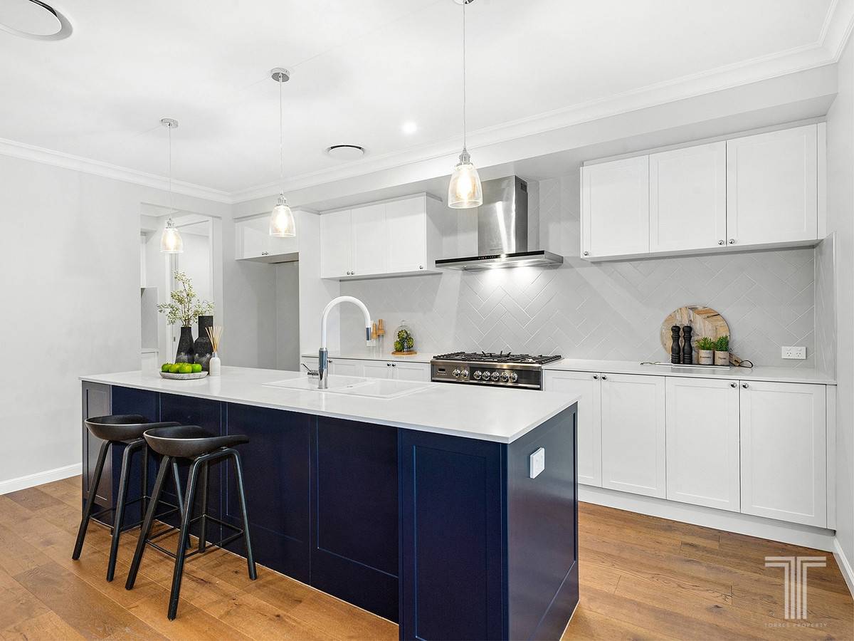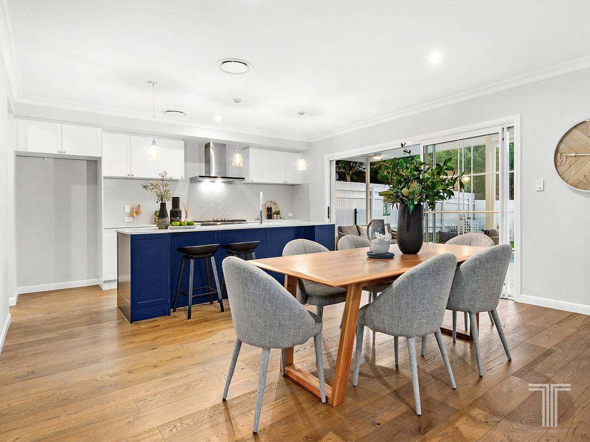 Leading into the inviting lounge and dining area, this relaxed yet elegant space is composed of timber floors, neutral tones, decorative cornices and beautiful windows. Adjoining the gourmet kitchen adorned with a feature island bench, herringbone splashback, Fisher & Paykel appliances, gas cooktop and a butler's pantry, every detail of this house has been designed to create effortless sophistication.