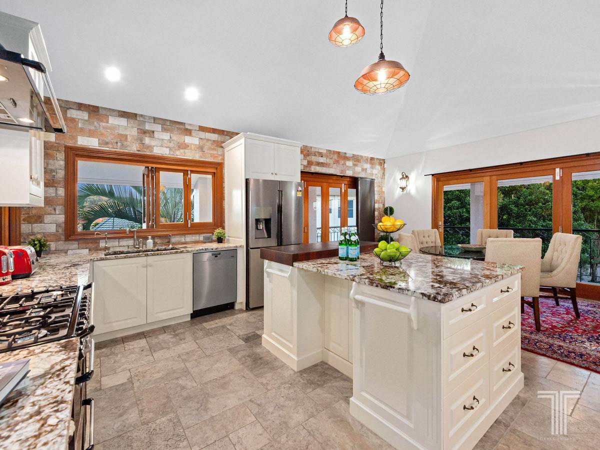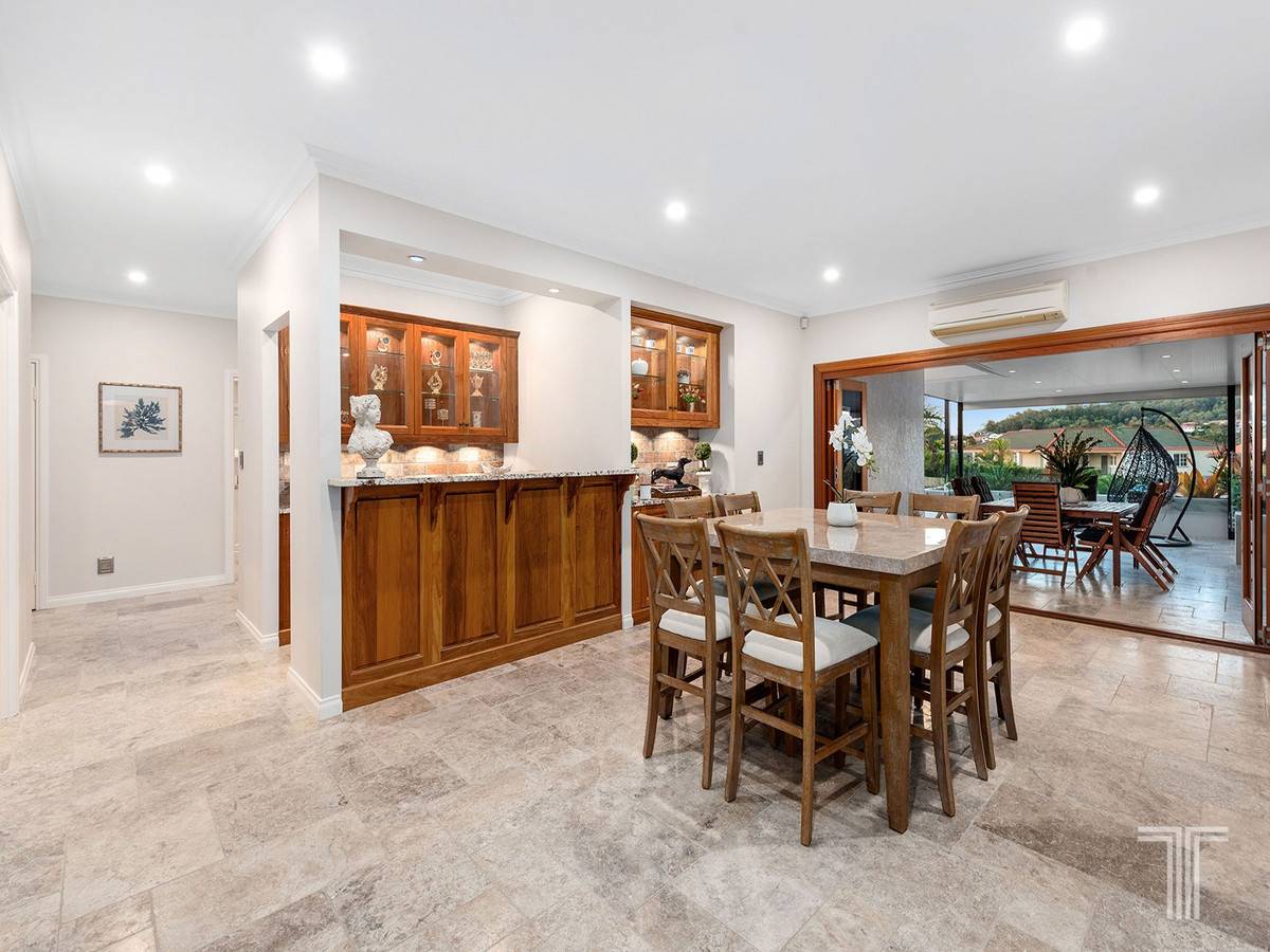 Finished to perfection, the exquisite European kitchen has embellished expense in every detail. Designed by award-winning Dana Kitchens, this culinary haven is adorned with beautiful hand painted cabinetry, stylish brick-look wall tiles, walk-in butler's pantry, top of the range smeg gas cooktop with double oven, built-in jarrah cutting board and stunning granite benchtops infused with timber fossilising, with centre island bench. Complete with a light filled dining area that is beautifully framed with rows of glass Bi-fold doors, opening up onto an entertainer's balcony embracing cooling north-easterly bay breezes.