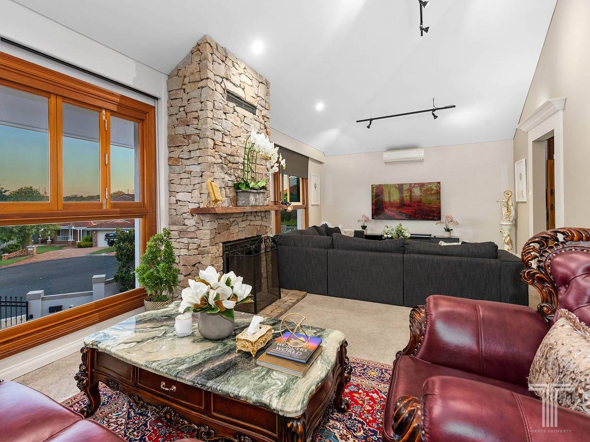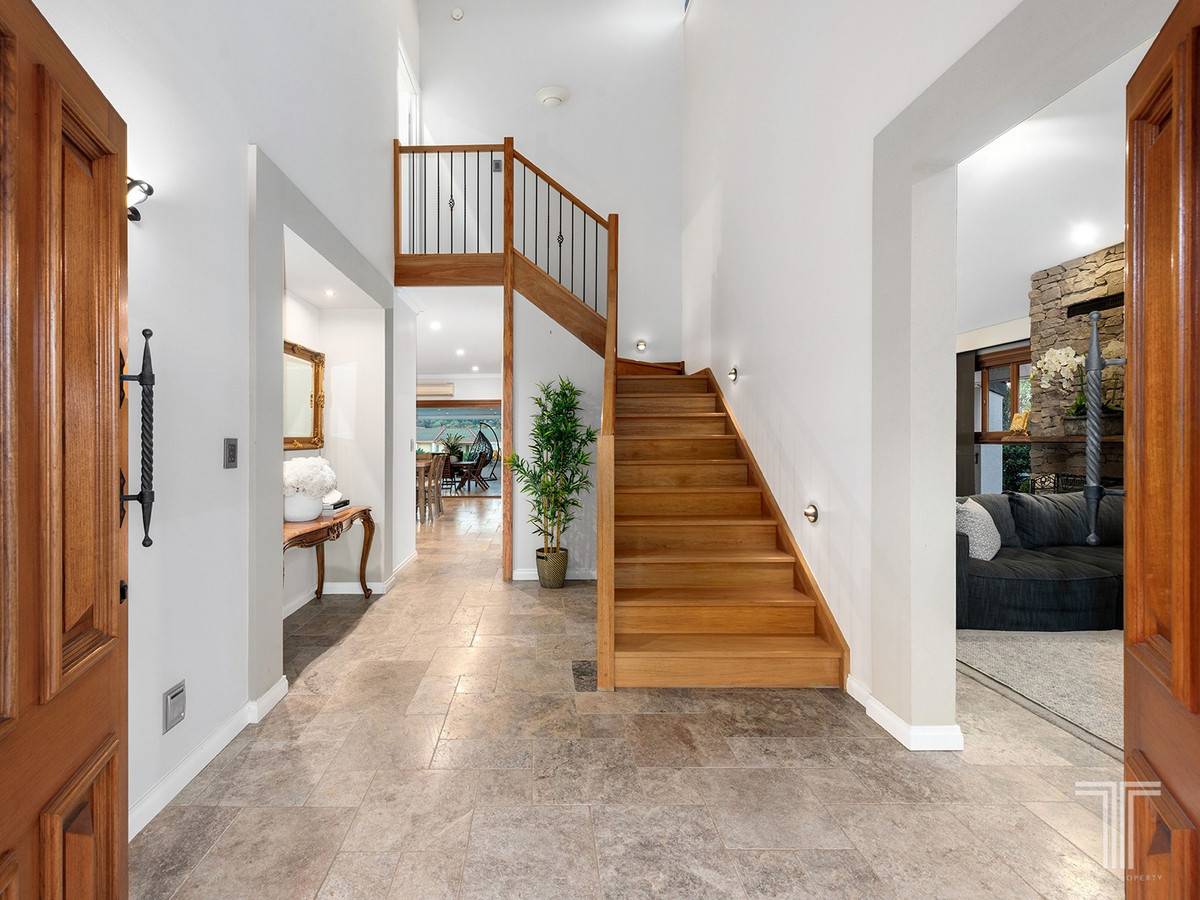 Destined to impress, the sprawling living room is filled with warmth and light. Composed of soaring slanted ceilings, travertine floor tiles, striking fireplace and rows of timber framed windows to draw in picture-perfect views that captivate from the moment you enter into the foyer.