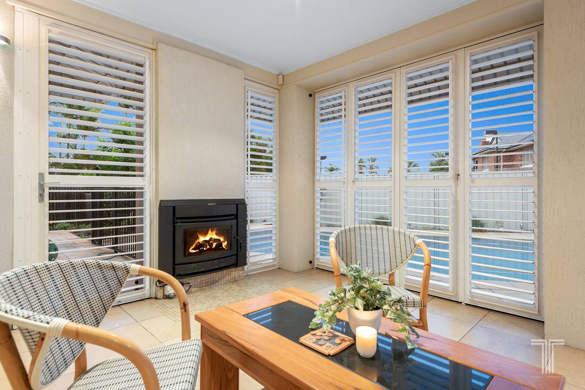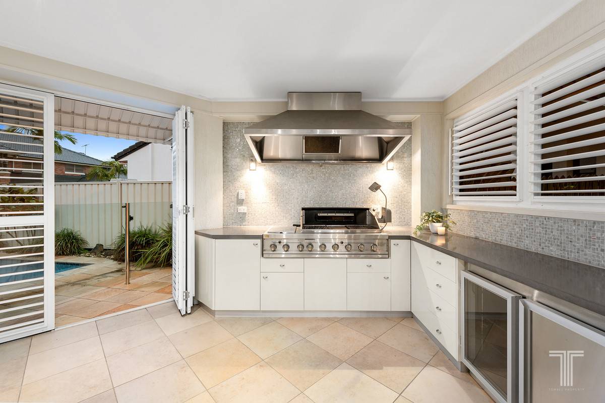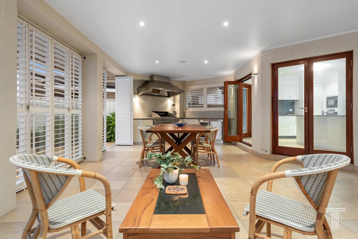 Accessed via bi-fold doors and perfect for all-weather entertaining, the enclosed terrace is framed by plantation shutters to draw in light and breezes. Featuring a fireplace and outdoor kitchen equipped with a built-in BBQ, rangehood, bar fridges and cabinetry, this outdoor oasis is sure to be the setting of many poolside summer days.