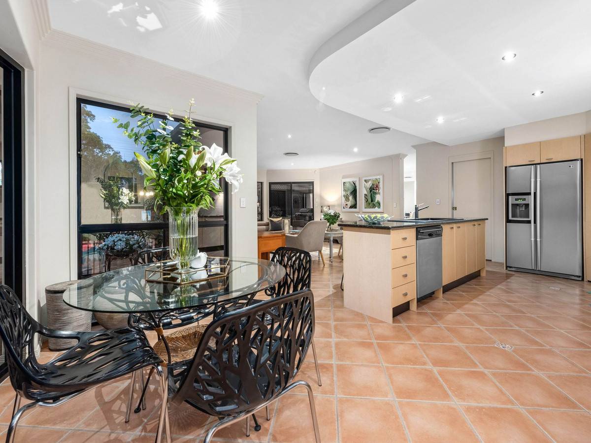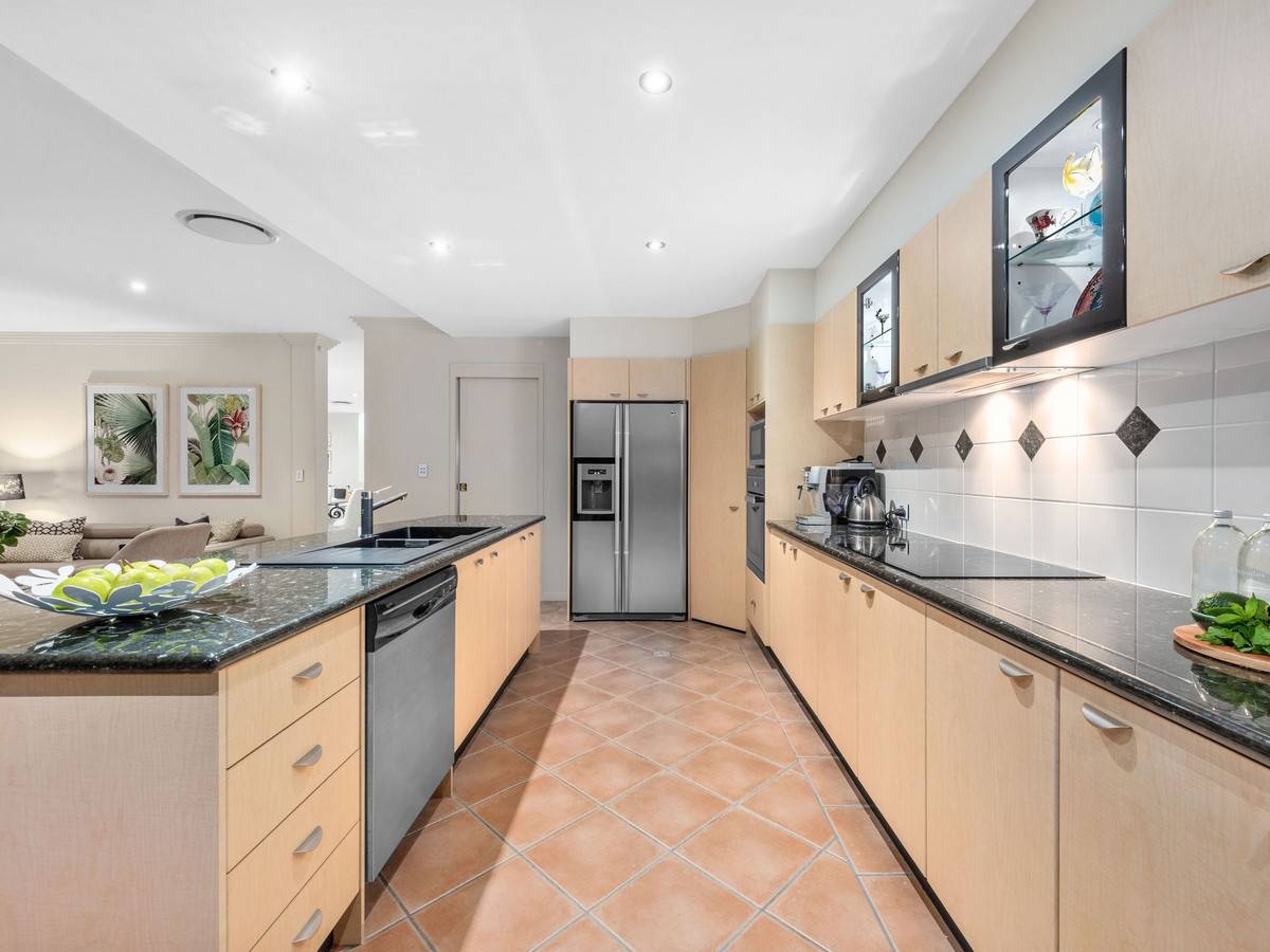 Open in design, the informal living and dining area gazes over the alfresco terrace and adjoins the well-appointed kitchen with stylish stone benchtops, Miele pyrolytic oven and a Schock double black granite sink.