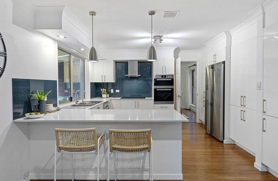 The home welcomes you into a spacious lounge area that flows seamlessly into the formal dining, living, and kitchen spaces. The recently renovated, open-plan kitchen is perfect for entertaining, connecting effortlessly with the adjoining living room, formal dining area, and the covered outdoor entertaining space. A downstairs bathroom is convenient for guests and ideal for busy mornings.