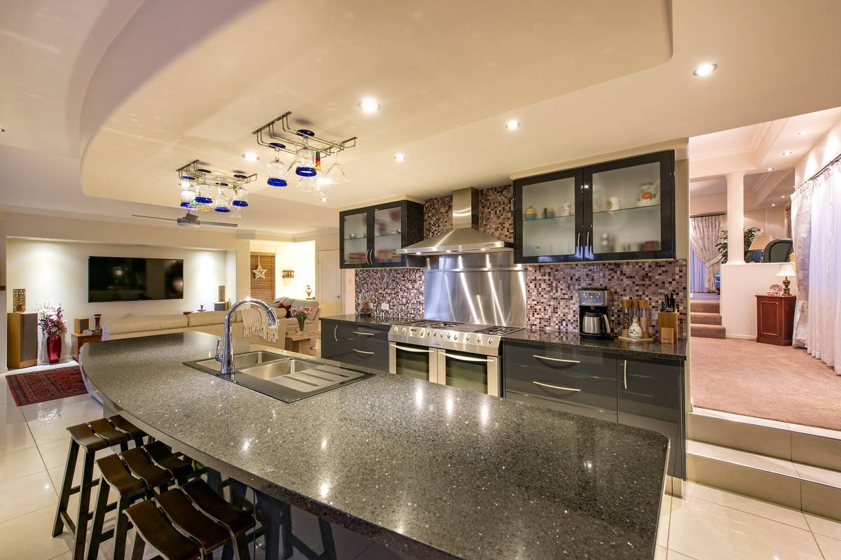 - Gourmet kitchen with black stone benchtops, island bench, dual ovens and gas cooktop