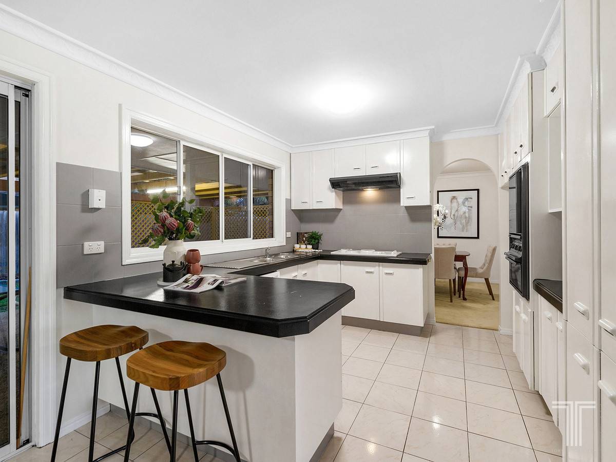 Centrally positioned and seamlessly connecting the array of living spaces, the kitchen is adorned with wraparound benchtops, breakfast bar and rows of cabinetry. Adjoining the open plan family and meals area, this culinary setting flows with ease out to the covered rear patio. Destined for entertaining and overlooking the manicured lawns and low maintenance gardens, this alfresco oasis is sure to be the site of many BBQs and parties.