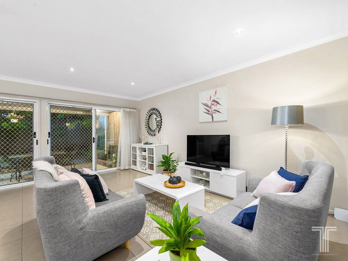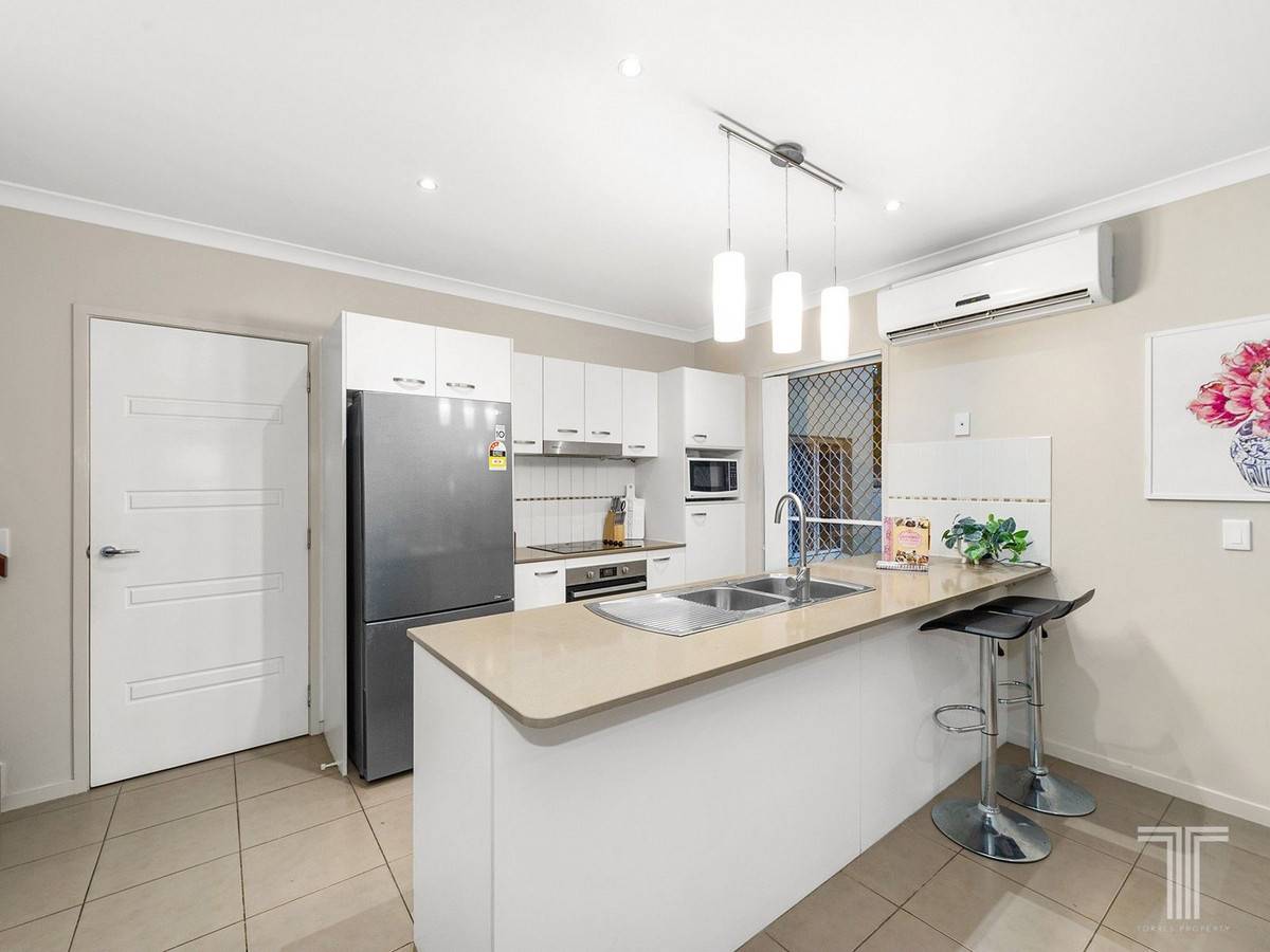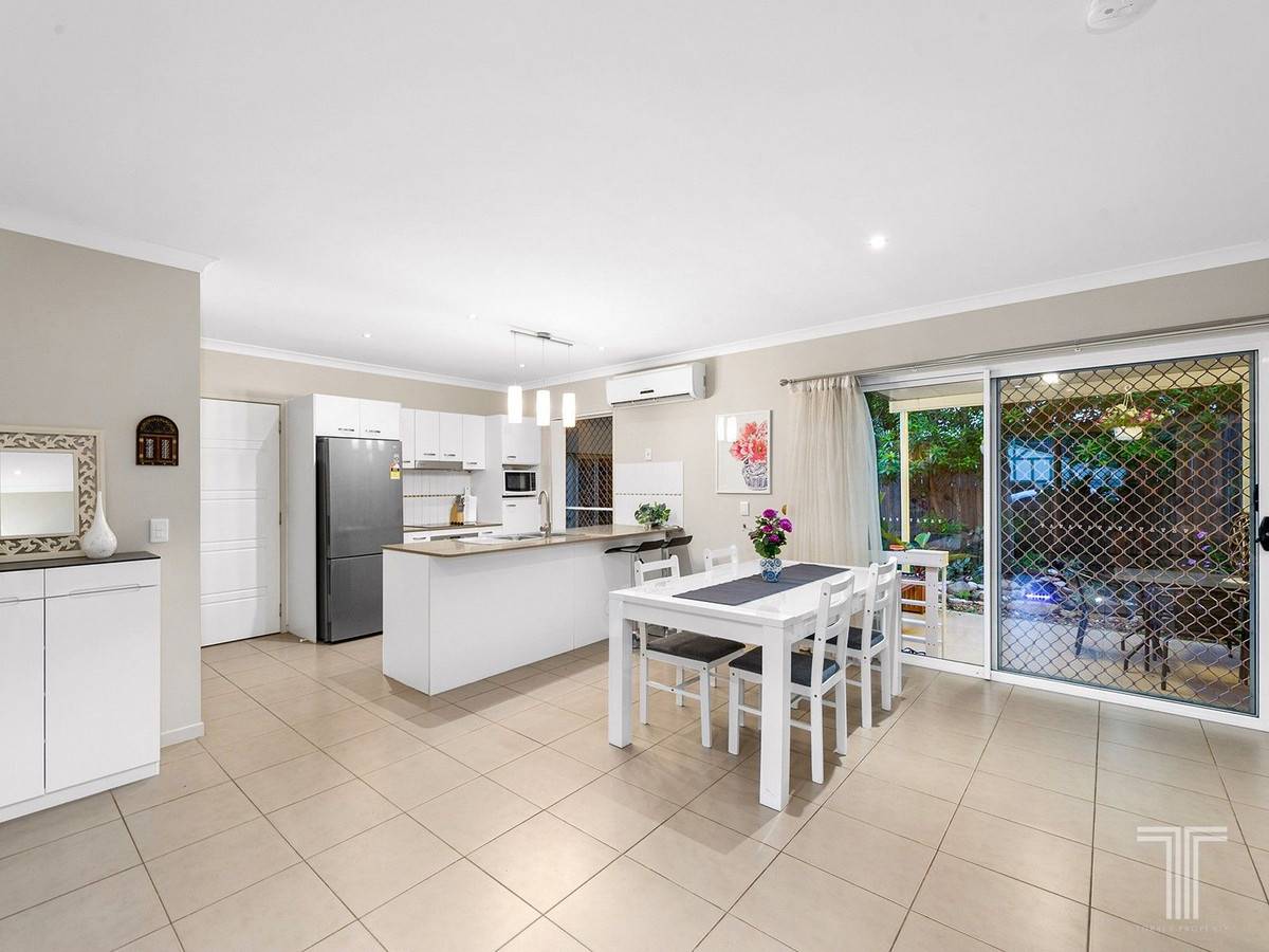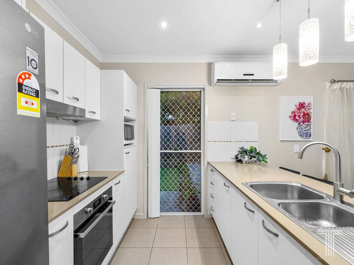 Spanning two generous levels, the home enters from the private front patio into the open plan lounge and dining area. Adorned with a neutral palette and stylish design, this living zone is kept cool with air-conditioning and adjoins the modern kitchen with sleek stone benchtops, stainless steel appliances and ample cabinetry.