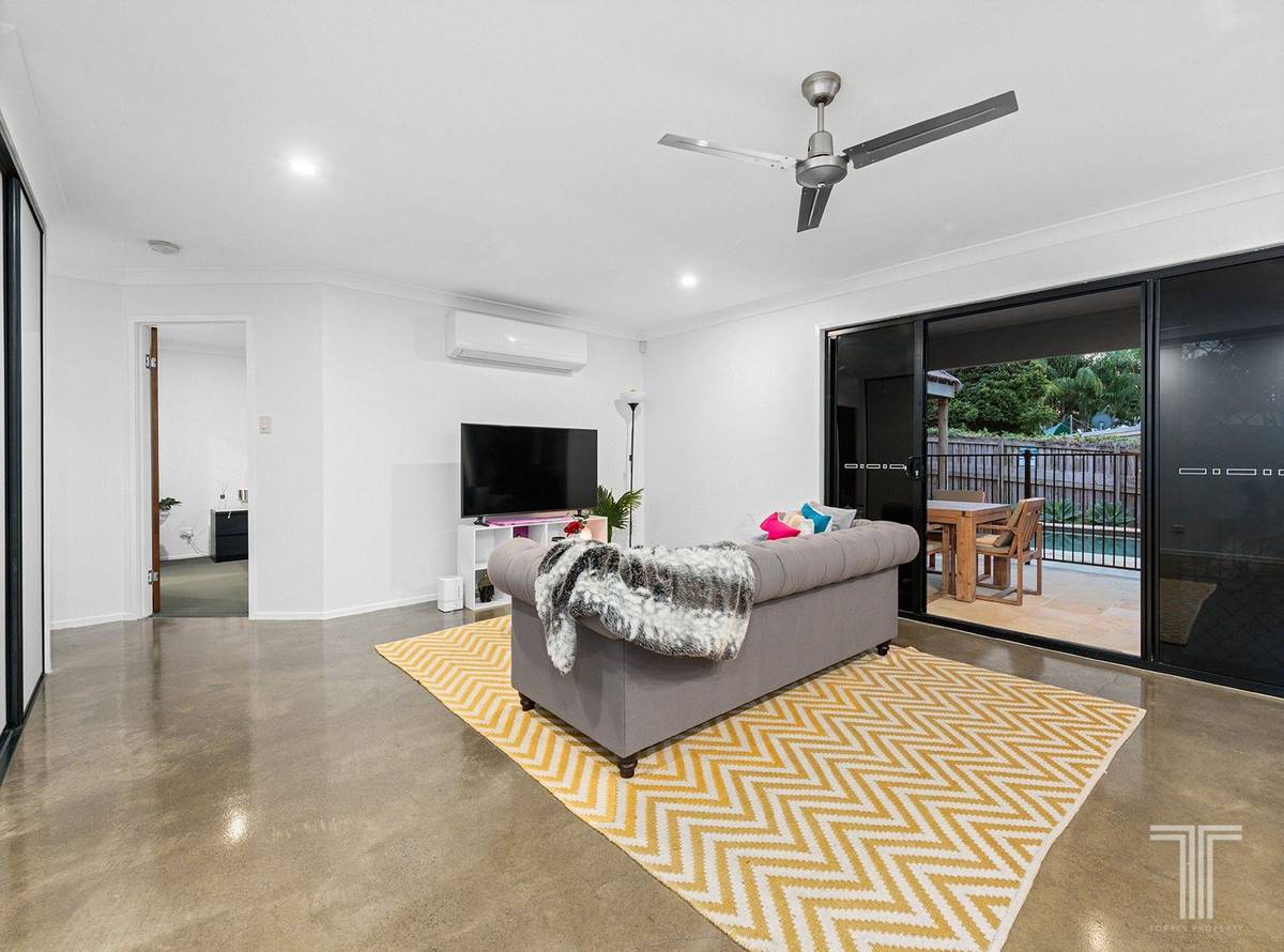 Stylishly updated with polished concrete floors and crisp white walls, the home's flowing design showcases multiple living areas and a resort-style saltwater pool.