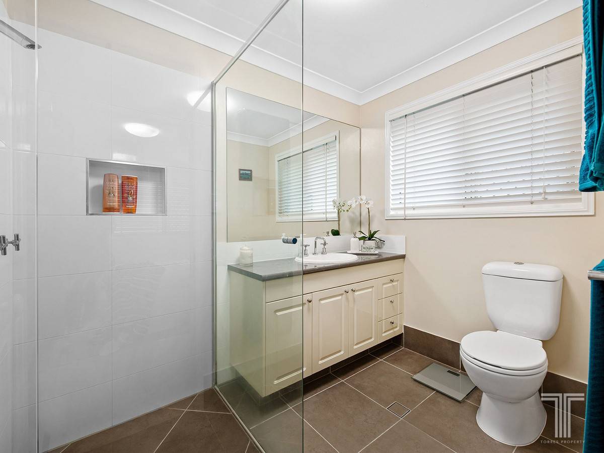 Positioned on the upper level are four double bedrooms, including an exclusive master with a walk-in robe and ensuite. The additional bedrooms feature built-in robes and are serviced by the family bathroom, while a fifth bedroom and third bathroom are located downstairs.
