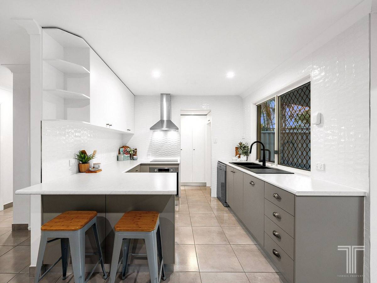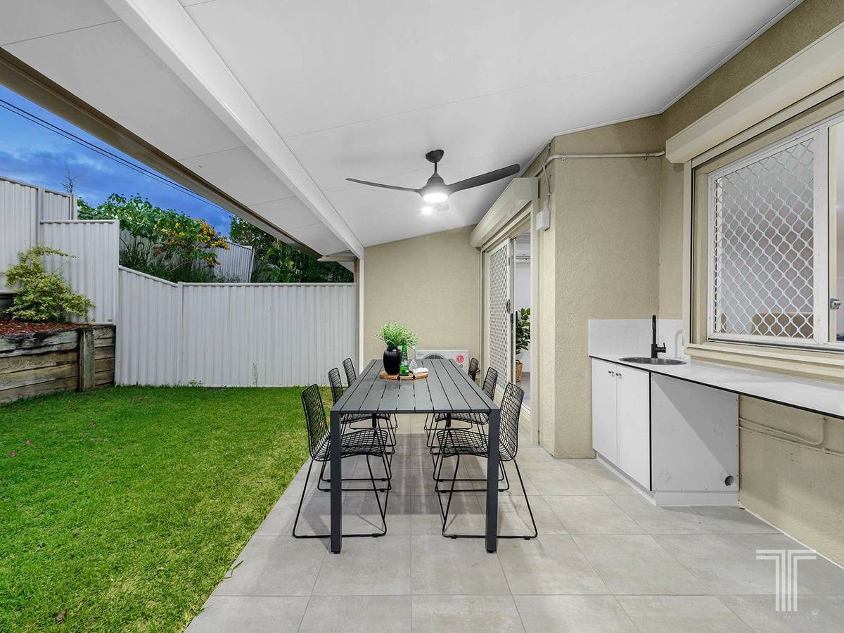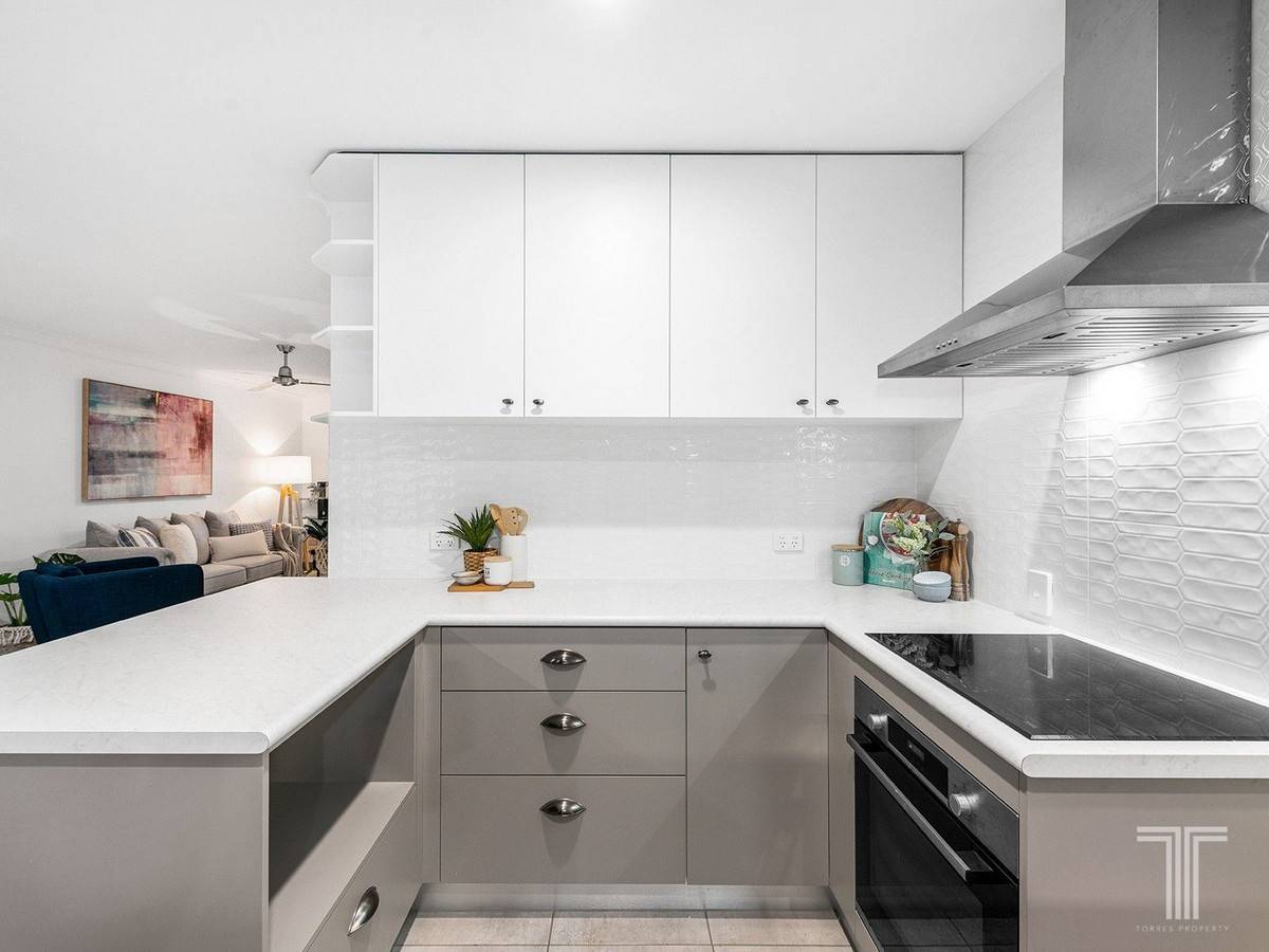Set across two levels, the ground floor features a spacious open plan living area finished with modern tiles, fresh neutral tones, ceiling fans and the comfort of air-conditioning. There is a generous living area, dining space and a contemporary kitchen with an induction cooktop.