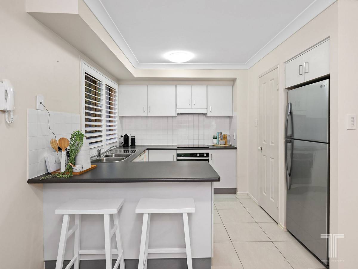 Positioned on the ground floor, the light-filled lounge room is kept cool with air-conditioning and flows with ease into the kitchen and dining area. Adorned with wraparound benchtops and a breakfast bar, the kitchen is equipped with a dishwasher, and quality Fisher & Paykel oven and ceramic cooktop.