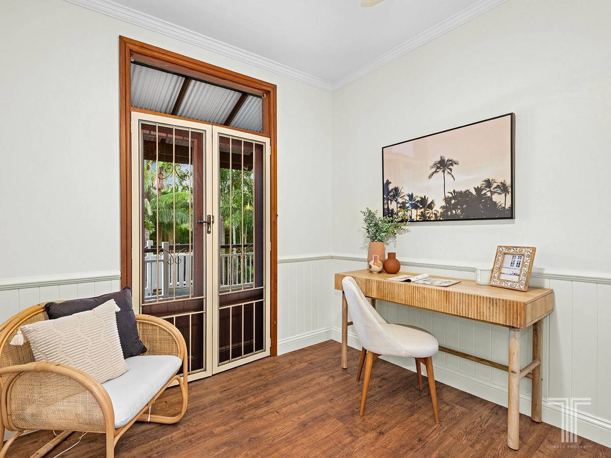 Hosting a selection of living spaces, the entryway leads into a relaxed lounge and formal dining room, each adorned with vinyl plank flooring, breezeways, high ceilings and French doors that open onto the verandah. Centrally positioned, the kitchen and meals area boasts beautiful outlooks across the greenery and rows of timber cabinetry.