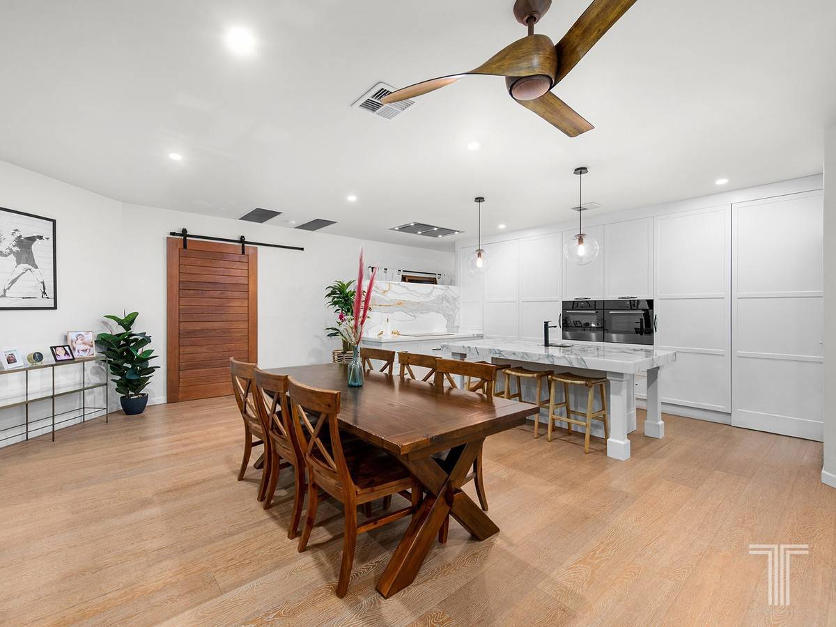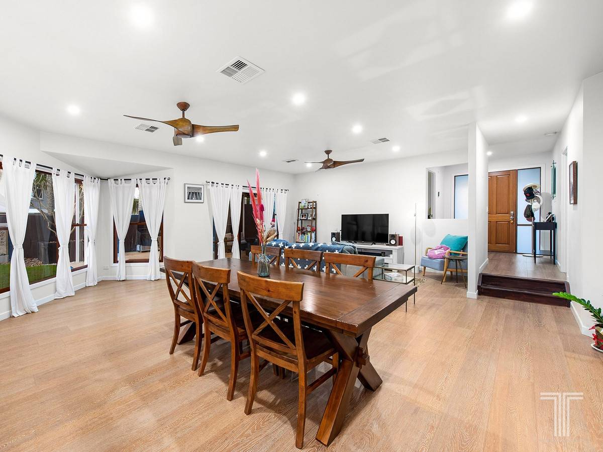 Elegantly designed with striking white walls accented with timber floors, fans and doors, the lounge and dining area is adorned with high ceilings and walls of glass that gaze out across the entertaining zones.
