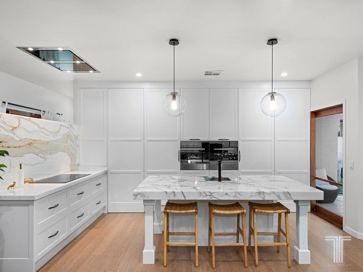 Showcasing a flowing layout for effortless family living, this light-filled space adjoins the exquisite chef's kitchen. Boasting a Calacatta marble island and splashback, 2 Pac shaker cabinetry, pendant lights and an expansive butler's pantry, this culinary masterpiece is appointed with a suite of VZUG appliances, including an induction cooktop, pyrolytic oven, steam oven and a Schweigen rangehood.