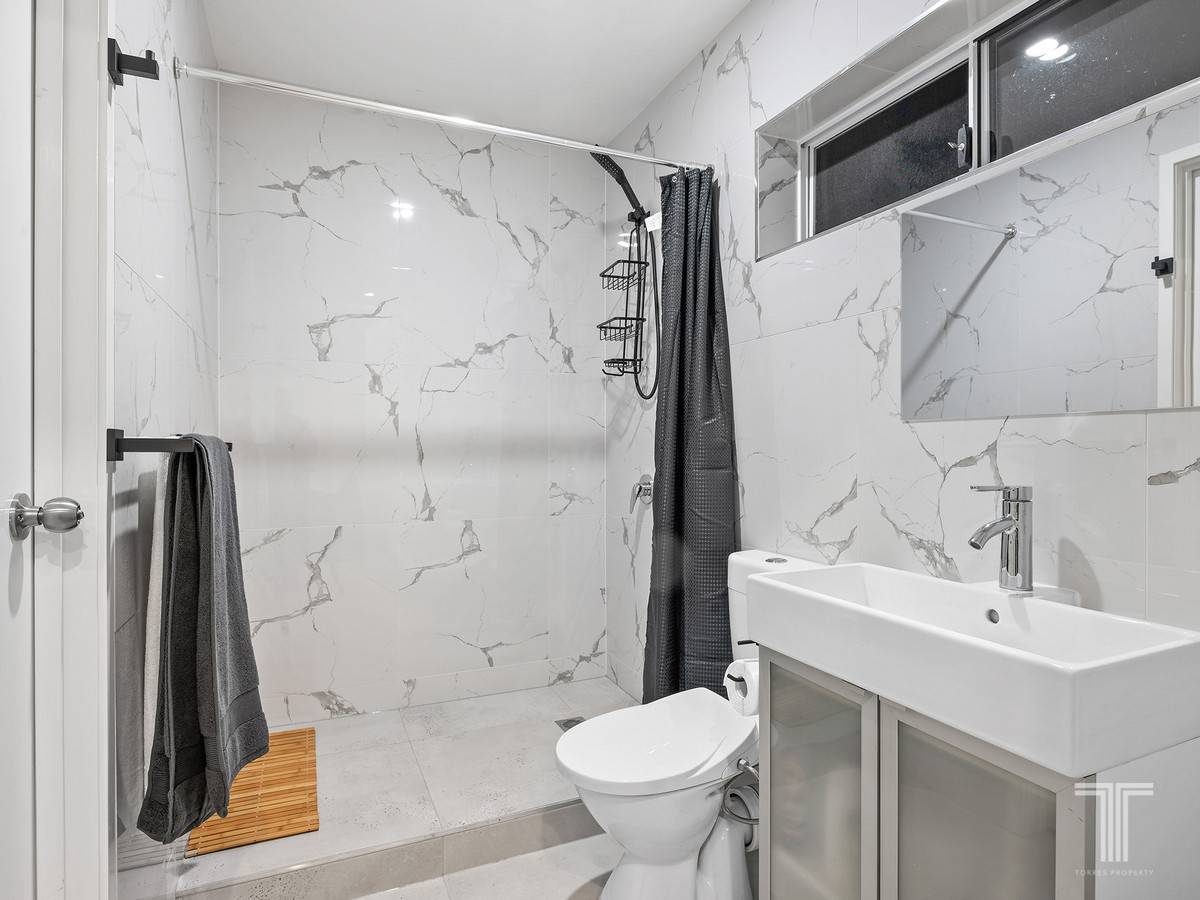 Hosting three bedrooms on this level, two include built-in robes, and the master boasts air-conditioning, access to the rear balcony and a modern two-way bathroom.