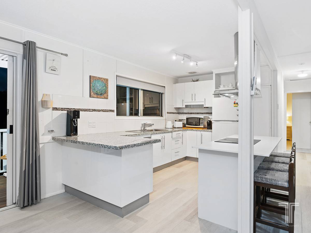 Entering inside, the stylish upper level unveils an open lounge and dining area extending out to two elevated balconies. Kept cool with air-conditioning, this living space adjoins the central kitchen appointed with stone benchtops, stainless steel appliances and an island bench with breakfast bar.