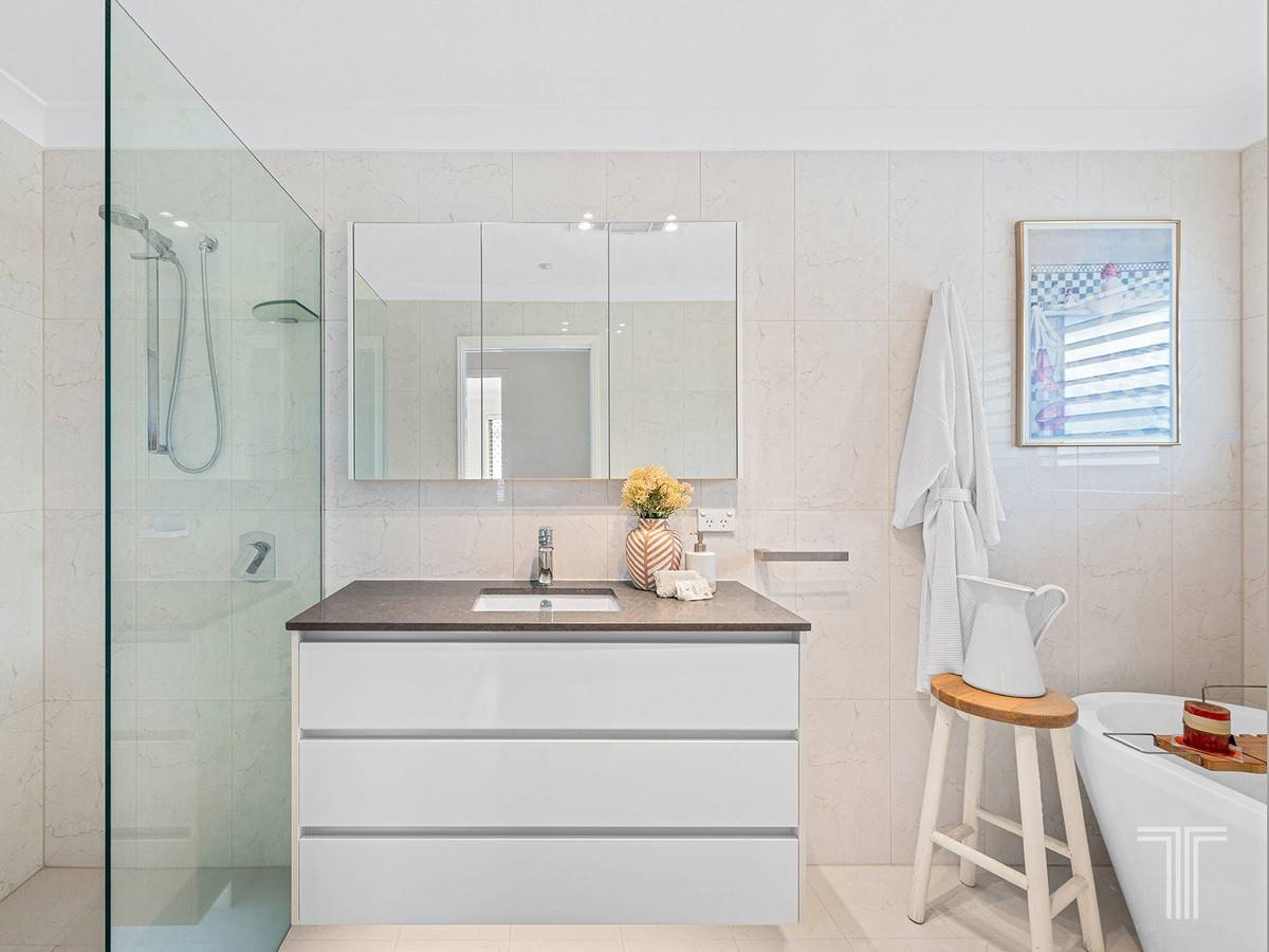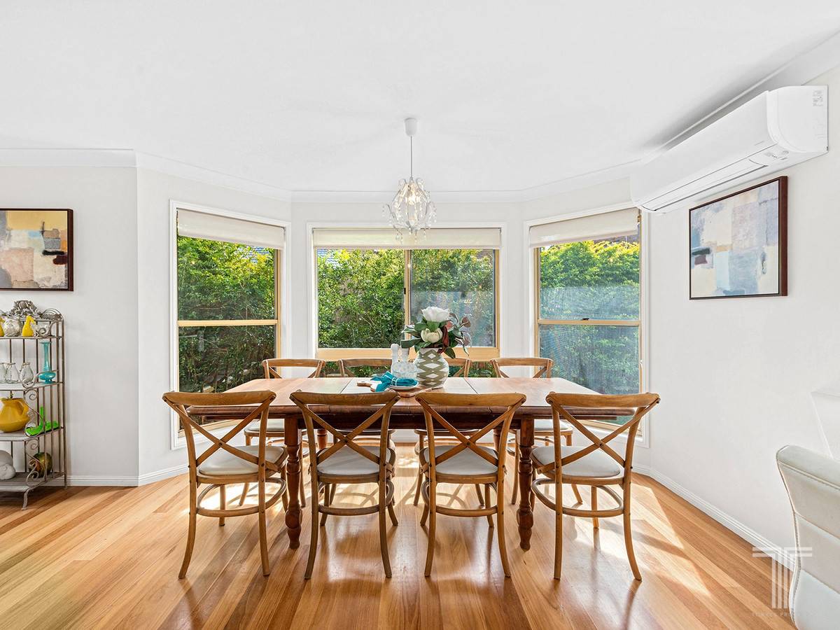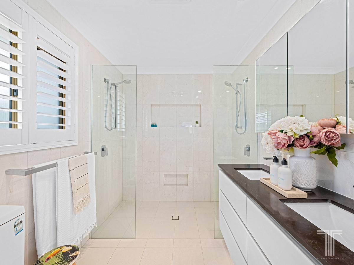 Located upstairs, you will find four light-filled bedrooms, including a spacious master retreat featuring leafy outlooks, a walk-in robe and an ensuite with dual vanities and a double shower. Positioned downstairs, a fifth bedroom is ideal for grandparents, guests, or a home office.