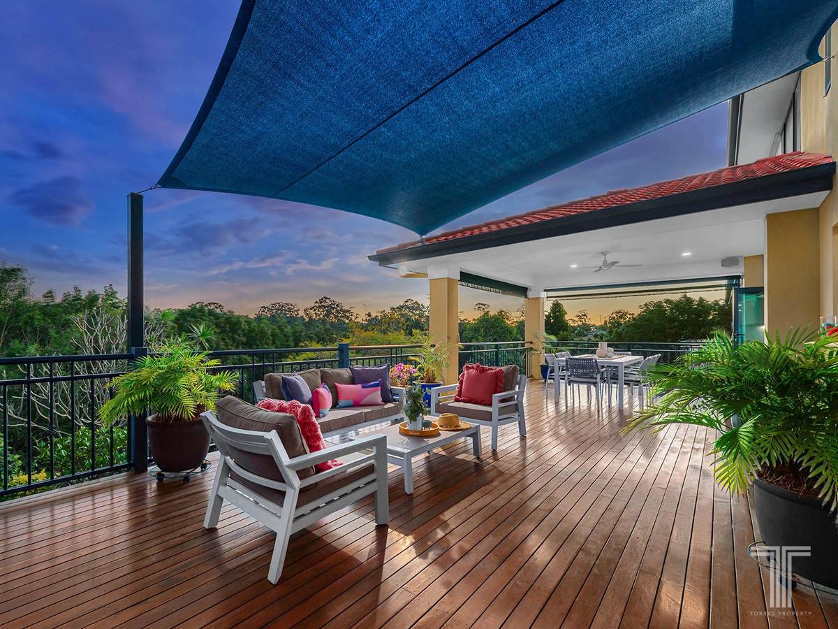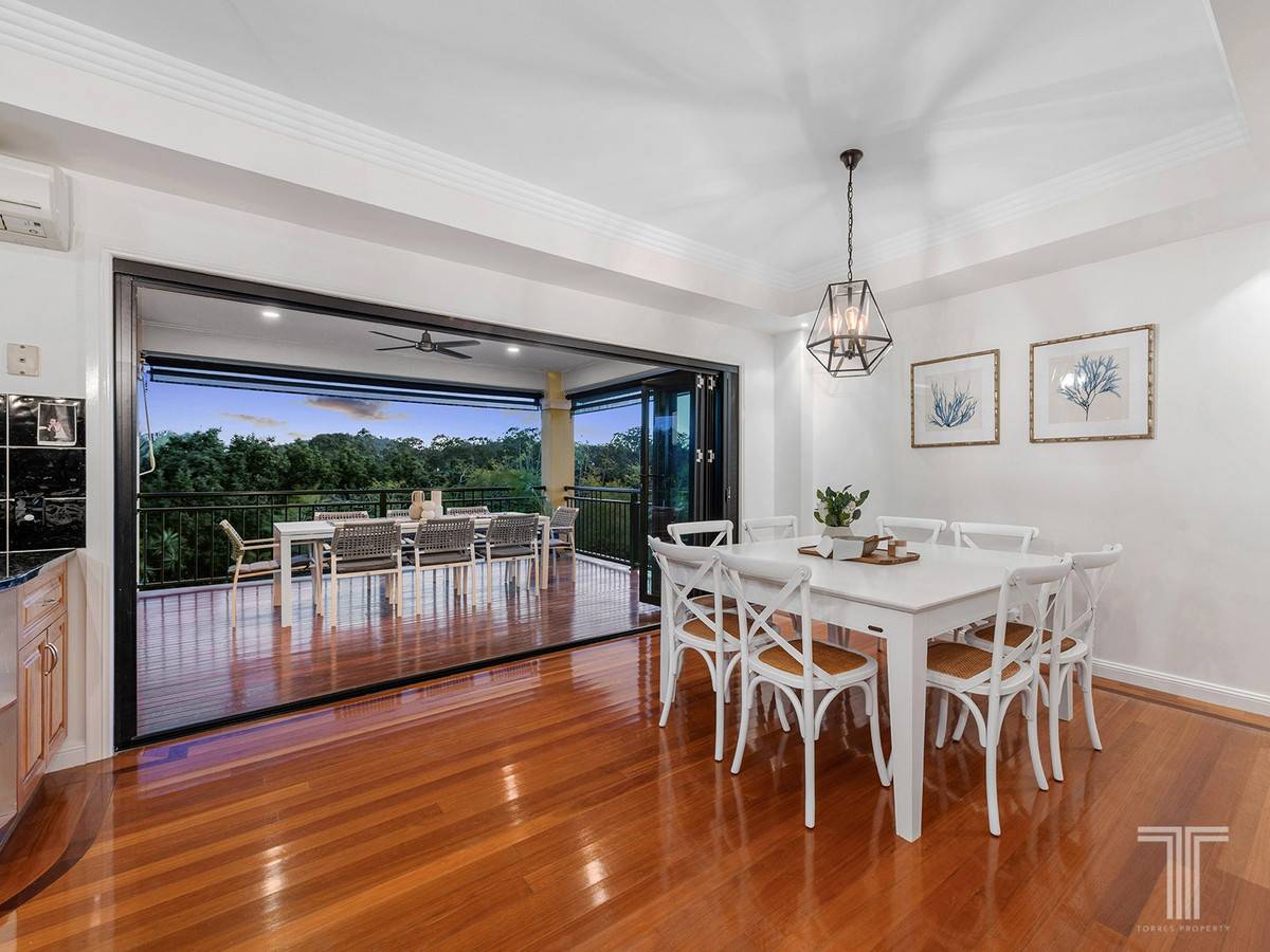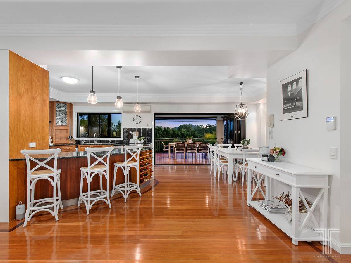 A secluded hideaway, the front gate opens to a tranquil alfresco entertaining area gazing over the glistening pool and manicured gardens. Making your way through the custom timber doors, step inside the open living area adorned with glossy Australian ironbark hardwood floors and bi-fold doors opening across the rear verandah. Delighting in breath-taking views out to glorious Mt Gravatt, these blissful outdoor entertaining spaces are sure to be the site of many family parties.