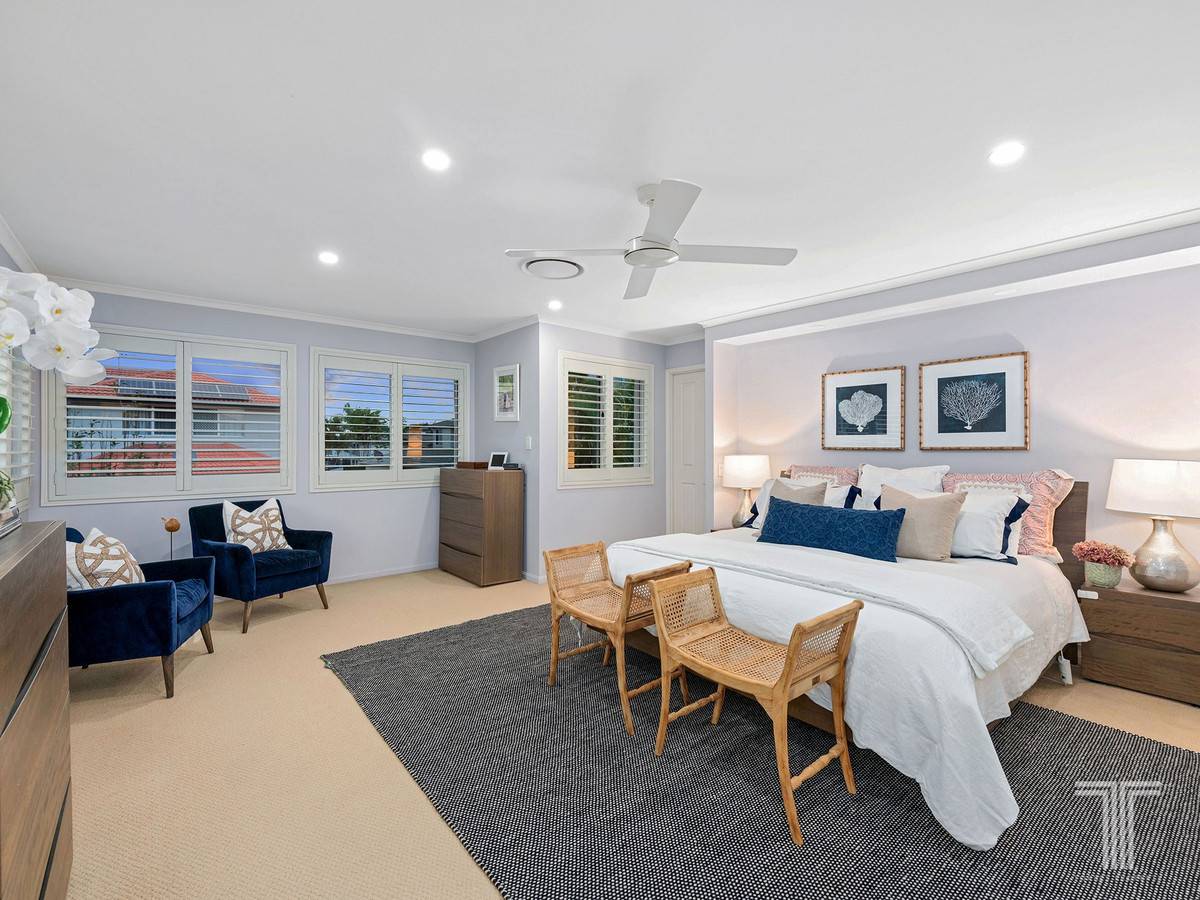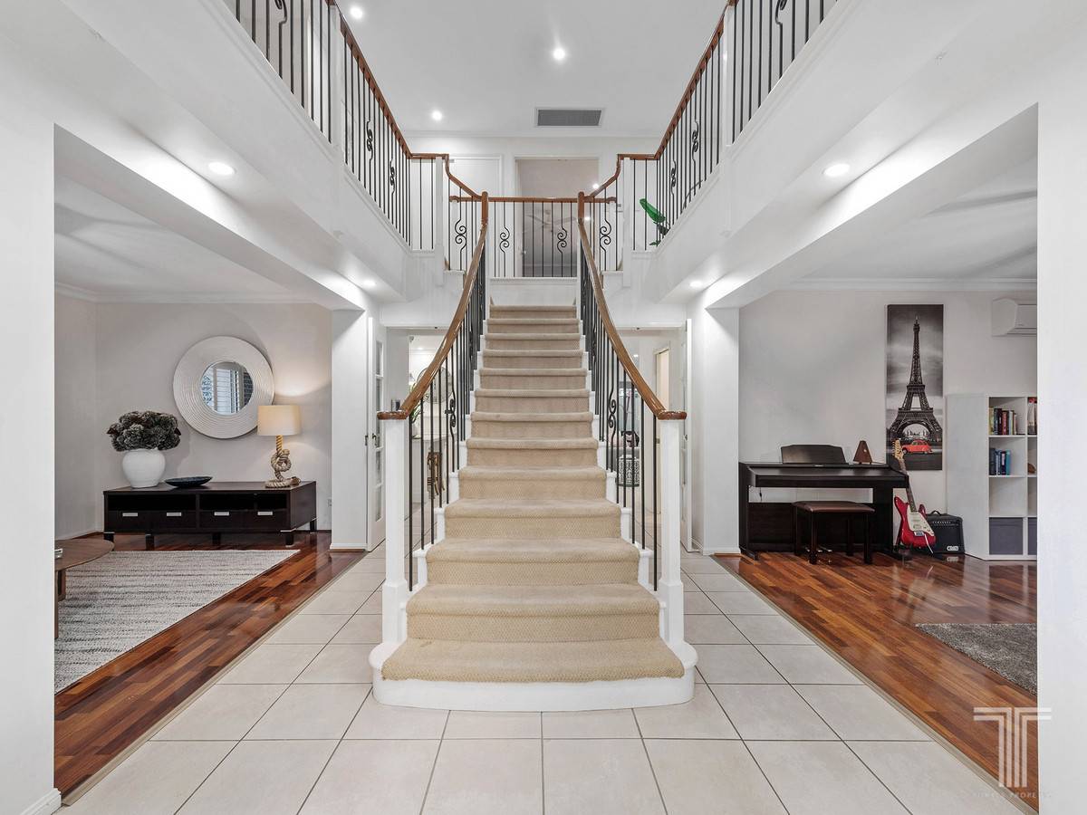 Framed by manicured, low maintenance gardens, the home features a stunning street presence. Opening the front door to the grand staircase, this formal entryway captures cooling cross breezes and creates a distinct separation between the formal lounge and dining rooms adorned with striking timber floors, high ceilings and plantation shutters.