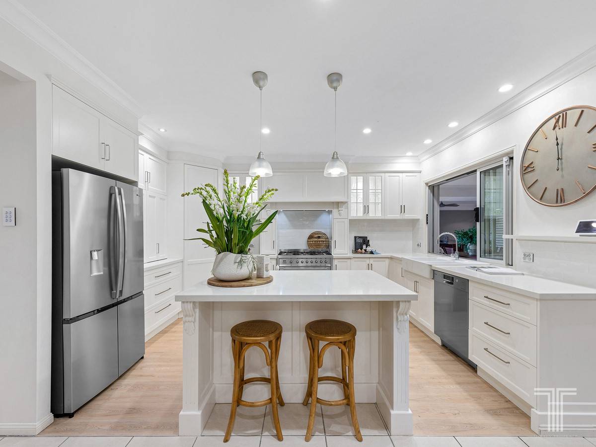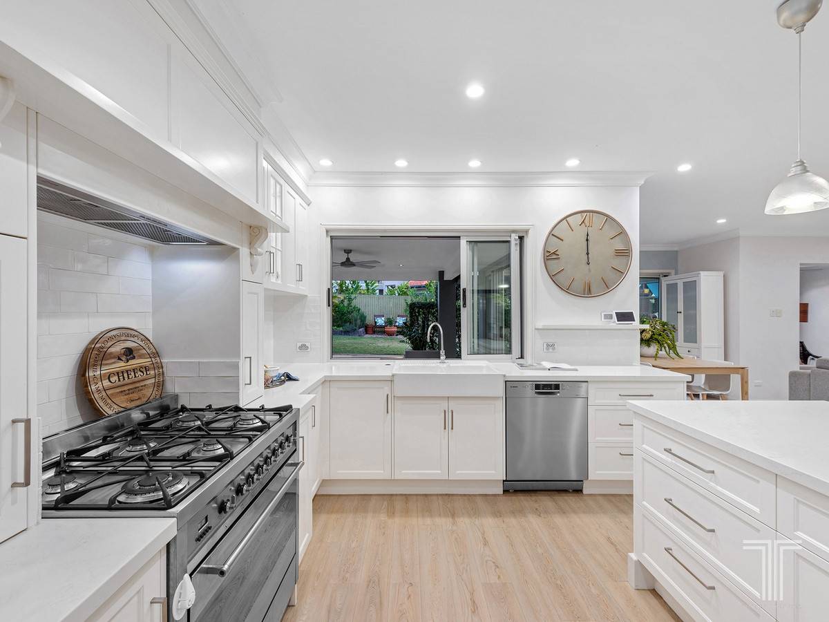Flowing through to the open family room, this living space offers the perfect place to gather and leads into the private rear lounge. Adjoining the family room and forming the heart of the home, the kitchen presents an elegant haven with abundant cabinetry, stylish stone benchtops, a chef's oven, a gas cooktop and servery to the outdoor entertaining area.